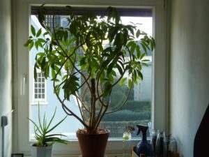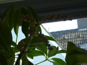 Dass aber Strahlenaralien nicht nur richtig alt werden können (bei meiner weiß ich nur noch sicher, dass sie über 15 Jahre bei mir ist …), sondern nach vielen, vielen Jahren plötzlich blühen können, das wurde mir erst im letzten Herbst/Winter klar. Damals dahte ich, die unscheinbare, aber klebrig tropfende Blüte sei eine einmalige Sache. Weit gefehlt. Diesmal sind es insgesamt 7 Ästchen, an denen sich teils sogar mehrere Blütenstände (wie diese leider etwas unscharfen hier) gebildet haben.