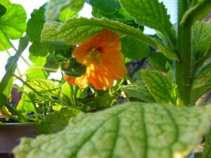 verschiedene Farben. Der Borretsch dagegen wartet noch auf den richtigen Moment, den die Kapuzinerkresse unter seinen Blättern bereits fand.