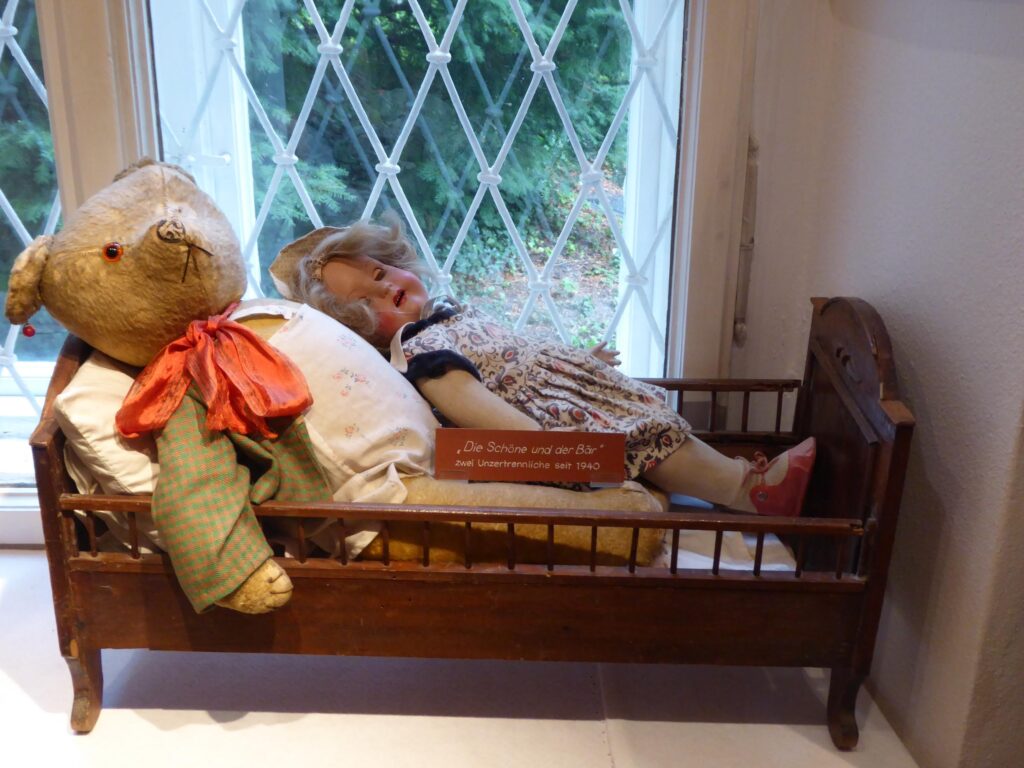 Im Gegensatz zu den beiden Langschläfern ist Ottilie, ein geborene von Steiff, ziemlich aufgeweckt und eindeutig reisebereit – oder wäre es, hätte sie nicht längst, wie diese beiden unter der schmiedeeisernen Treppe, ein Zuhause gefunden, das alles andere als ein Abstellgleis für Puppen ist.