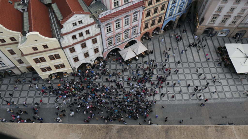 Viele andere Menschen dagegen begegneten uns im restlichen Verlauf des Tages. Auf dem Rathausplatz in der Altstadt strömten uns die Massen entgegen, sodass wir uns ins alte Rathaus flüchteten und dort einer englischsprachigen Führung anschlossen. Anscheinend gibt es in dieser jahrhundertealten Stadt zwei Möglichkeiten, Revolutionen, Kriege und Umstürze verschiedenster Art auszulösen: man wirft Abgesandte aus Fenstern der Burg beziehungsweise des Rathauses der Neustadt, oder der Stadtrat einigt sich auf einen Entwurf zum endgültigen Weiterbau des Rathauses in der Altstadt. Ich wünschte, ich hätte mir alles merken können, was uns bei dieser Führung so voller Begeisterung erzählt wurde … so bleibt mir das Gefühl, die Prager Stadtgeschichte ein wenig gestreift zu haben und der Wunsch, mehr über sie zu erfahren.